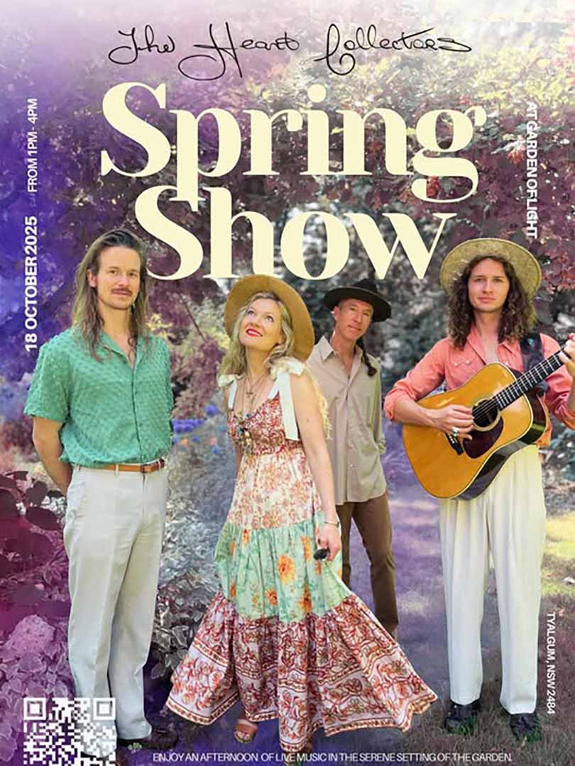 Join The Heart Collectors for this special spring event in the Garden of Light in Tyalgum, NSW. Featuring catering from Flutterbies Cottage Cafe, including boutique gins, tasty barbeque goods, cakes and more. Complimentary Bus from Flutterbies Cottage Cafe to the Garden location, buses start at 1pm.